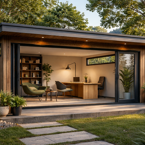 A professional render of Garden Green Lane highlights a small rear home workspace. The visualization emphasizes simplicity and functionality, showing how the design integrates comfort and practicality within a compact area.